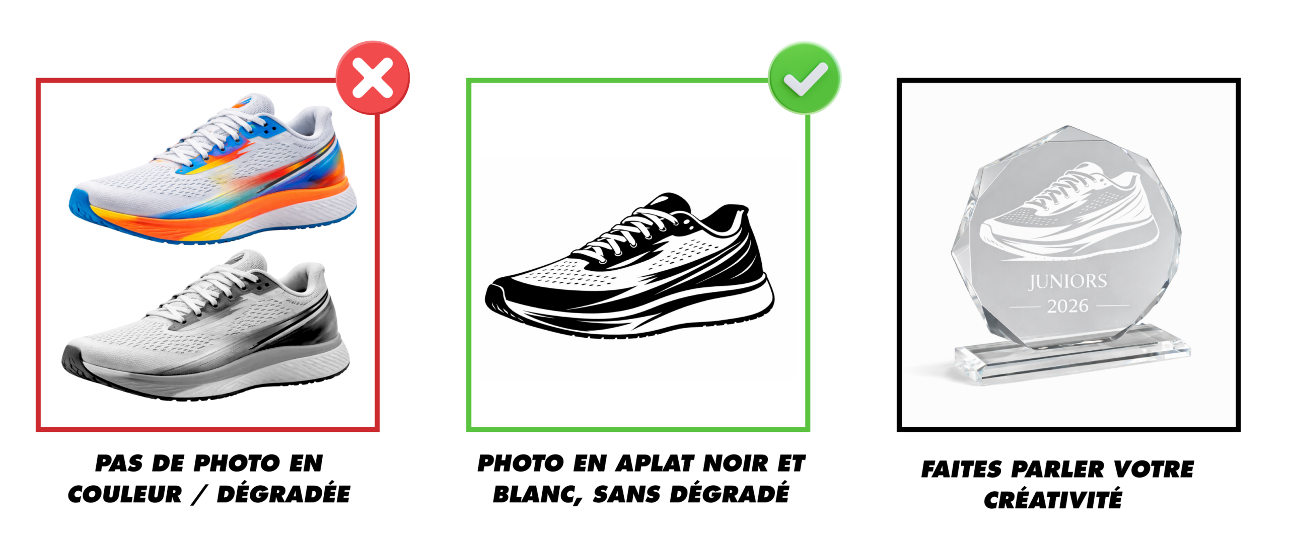 Important for engraving: To obtain a clean and elegant marking, your visuals must imperatively be provided in black flat (100% black), without gradients or grayscale.