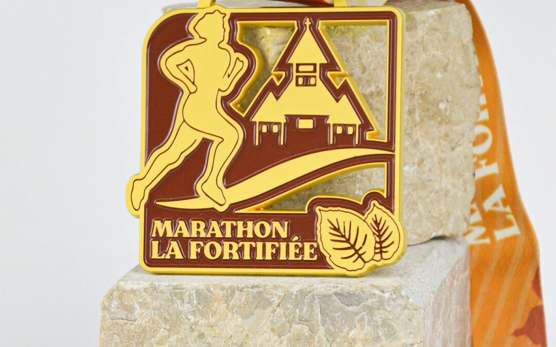 Pour célébrer cette épreuve sportive d’exception, une médaille Finisher a été spécialement conçue. Entièrement personnalisée selon le logo du marathon, cette médaille en métal doré est agrémentée de nuances terracotta, reflétant l’identité visuelle de l’événement. Ce bijou de conception est bien plus qu’un simple souvenir ; il symbolise l’accomplissement et la persévérance des coureurs qui ont relevé le défi de La Fortifiée.