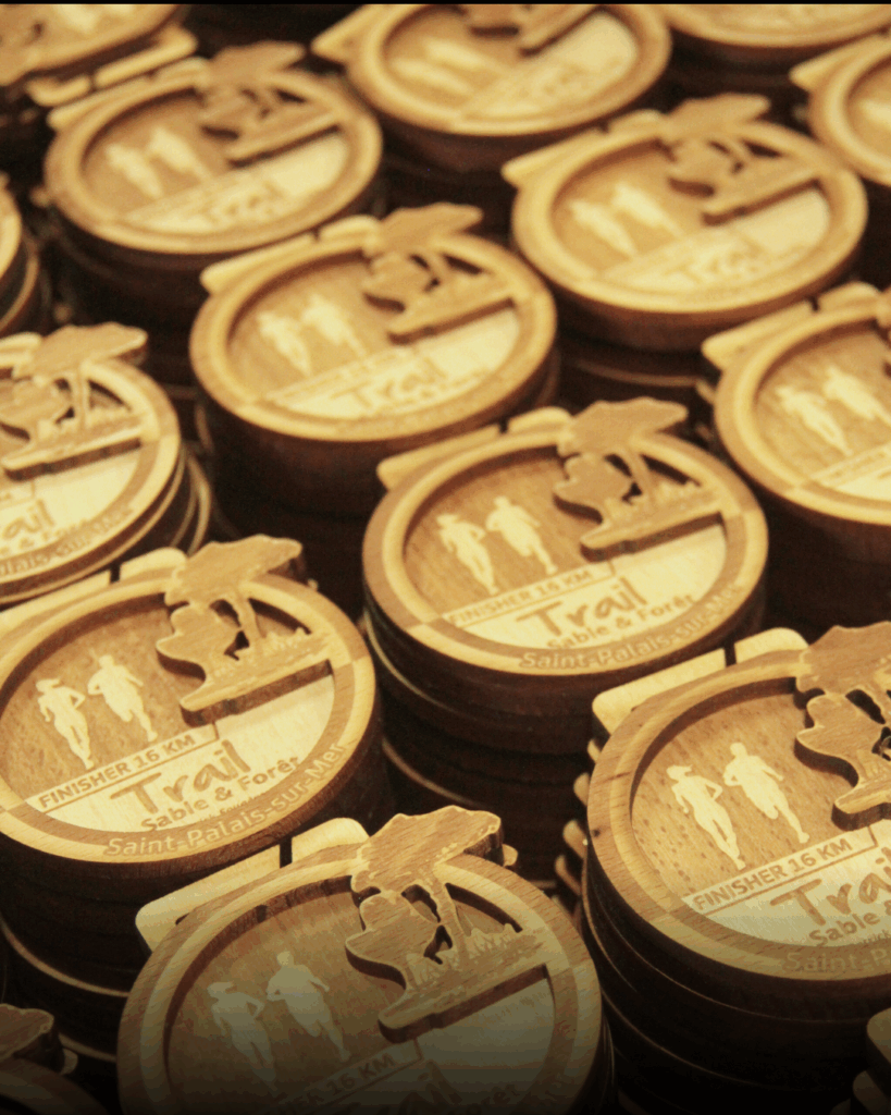 Des trophées en bois sur mesure pour les podiums et des médailles en bois gravées avec surépaisseur pour les finishers.