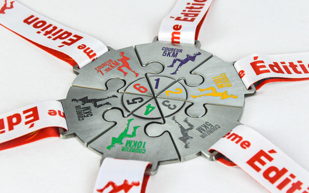 La médaille finisher, conçue en format puzzle à six pièces, est bien plus qu’un simple souvenir : elle est le reflet parfait de l’esprit Ekiden. En personnalisant chaque médaille selon la distance et en permettant leur assemblage, elle honore à la fois l’individualité de l’effort et la force du collectif.