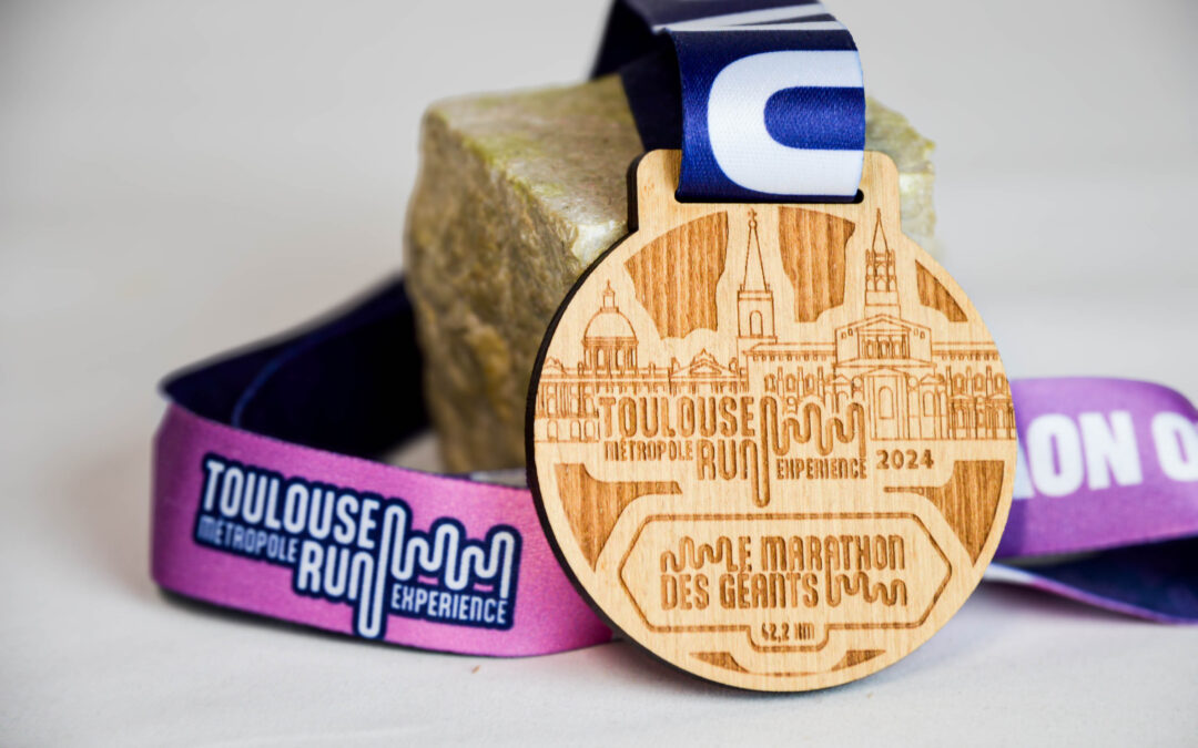 Pour célébrer l’engagement et la performance de chaque participant, une médaille finisher unique a été spécialement conçue pour cette édition 2024. Fabriquée à partir de bois de hêtre massif issu de forêts françaises, cette médaille incarne les valeurs d’authenticité et de respect de l’environnement, en parfaite harmonie avec l’esprit du Marathon de Toulouse.