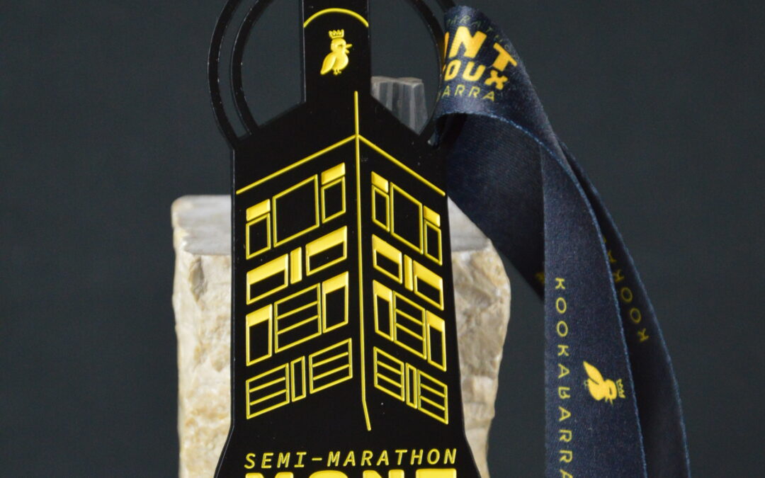Pour récompenser cette épreuve hors du commun, une médaille Finisher à la hauteur du challenge a été imaginée. Réalisée en métal de qualité, elle reprend le profil emblématique du Mont Ventoux, avec en relief la silhouette de la mythique tour blanche et rouge qui trône au sommet. Ce design sobre mais puissant s’inscrit sur une base noire élégante, rehaussée par les touches jaunes de l’identité visuelle de la course, signature graphique du Semi-Marathon Kookabarra du Mont Ventoux.