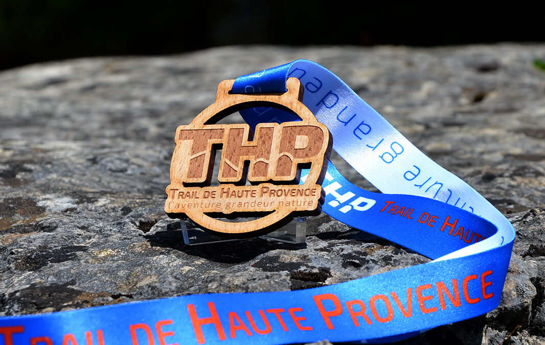 La personnalisation a été effectuée grâce à une gravure et découpe laser de haute précision, reprenant le logo emblématique du trail. Associée à son ruban personnalisé, la médaille devient un souvenir unique qui relie chaque participant à l’histoire et à l’âme du territoire de Haute Provence.