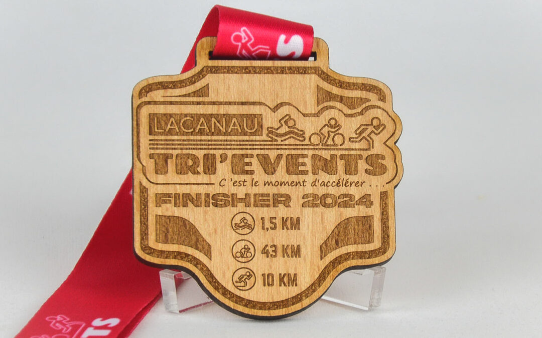 Pour couronner les efforts des participants, la médaille Finisher du Triathlon de Lacanau a été spécialement conçue pour refléter l’esprit de l’événement. Réalisée en bois d’origine française et gravée au laser, cette médaille personnalisée représente bien plus qu’une simple récompense : c’est un souvenir durable de l’accomplissement personnel et de la participation à une compétition prestigieuse.