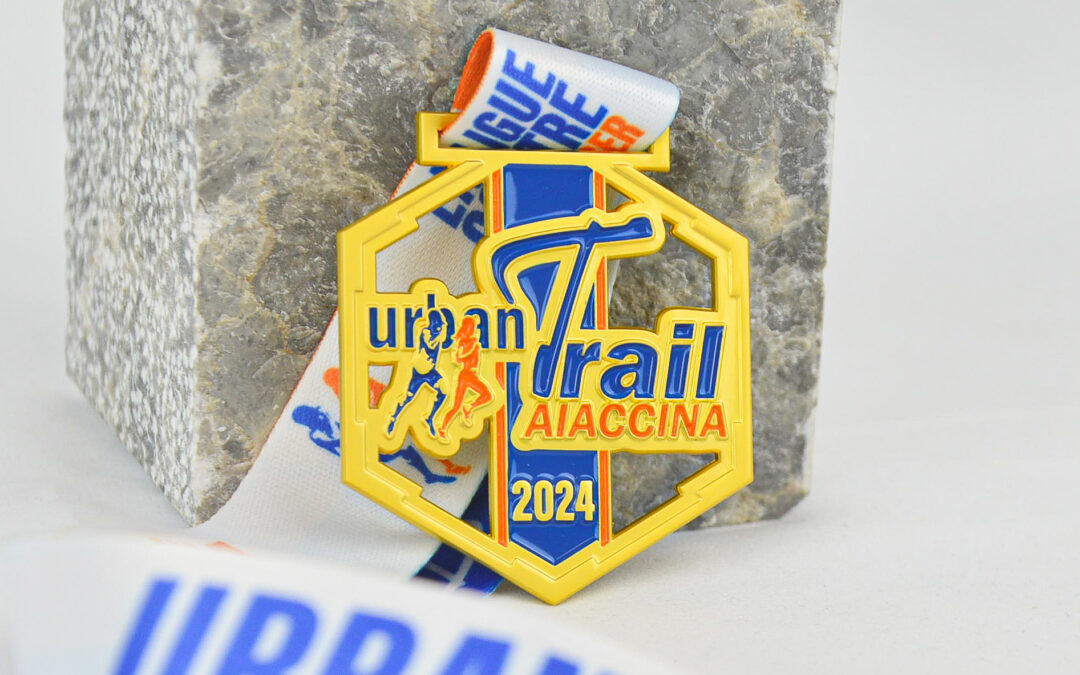 La médaille Finisher de l’Urban Trail Aiaccina 2024 a été spécialement conçue pour refléter l’esprit de cette course unique. Réalisée en métal avec un coloris or mat, elle reprend les coloris du logo de l’événement pour une touche de personnalisation. Son design inclut des découpes originales dans le métal, soulignant l’exclusivité et l’identité visuelle forte de l’Urban Trail. Accompagnée d’un ruban personnalisé portant le nom de la course, cette médaille symbolise non seulement l’effort fourni par chaque participant, mais aussi leur contribution à une cause solidaire.