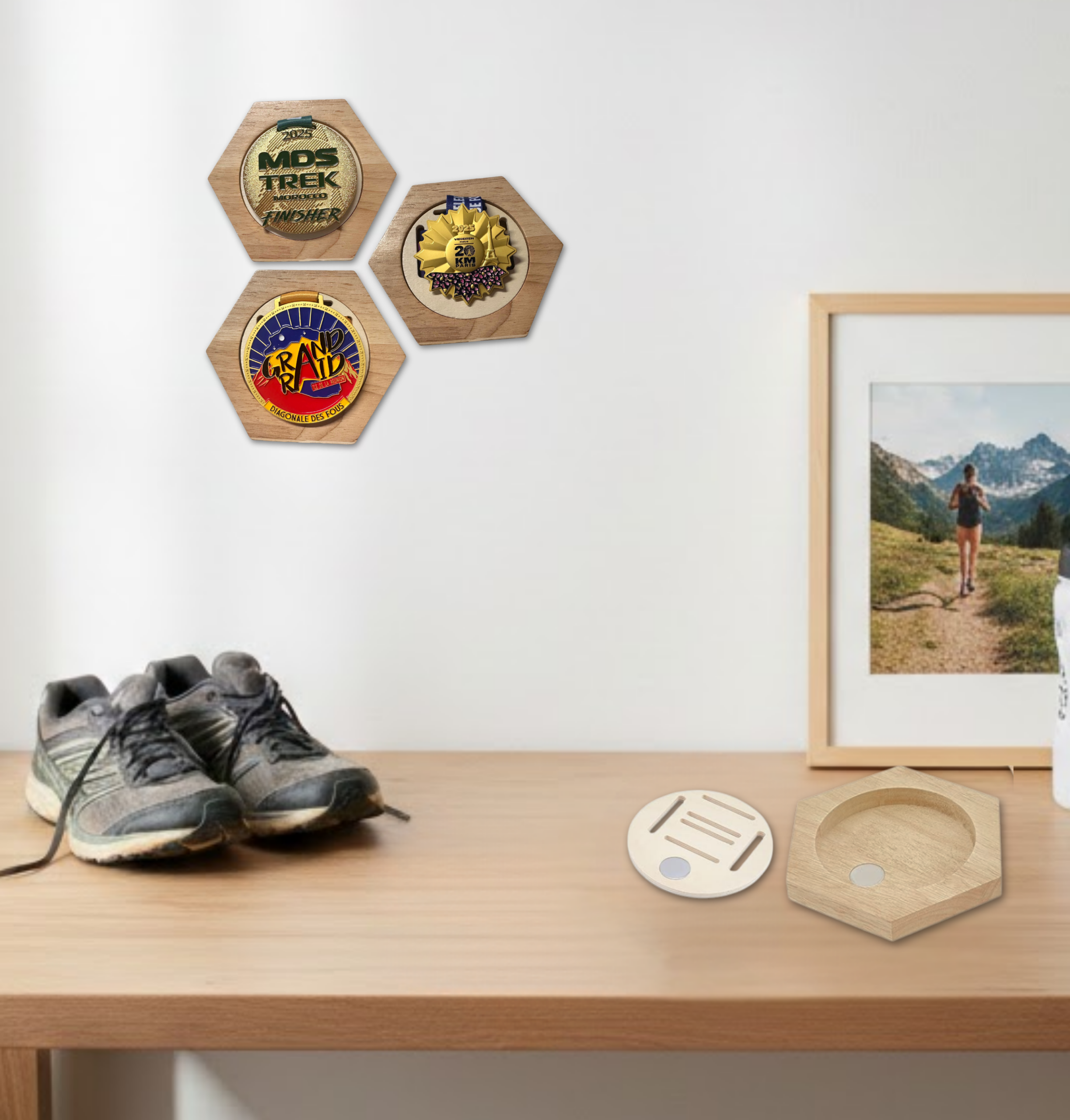 Medal holder display stand in natural wood, with a honeycomb design, designed to highlight your awards, at home or as a gift. Elegant and easy to install thanks to its self-adhesive system, it sublimates your medals while bringing a natural decorative touch.