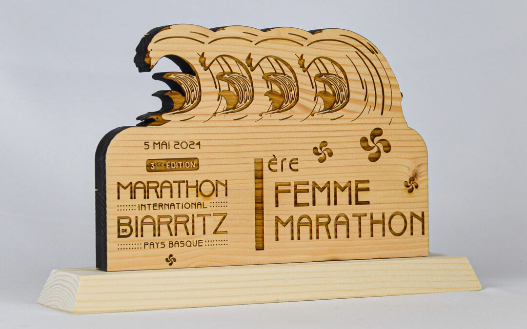 Pour honorer les vainqueurs de cette épreuve prestigieuse, un trophée sur-mesure a été spécialement conçu. Ce dernier reflète parfaitement l’identité du marathon et du Pays Basque. Réalisé en bois, il s’inscrit dans une démarche de respect de l’environnement et de mise en valeur de l’artisanat local. Le trophée a été élaboré en utilisant des techniques de découpe et de gravure laser, offrant ainsi une grande précision et une personnalisation complète selon le logo et le format du marathon.