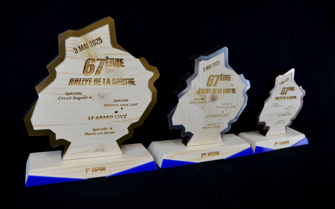 Pour récompenser les pilotes, l’ASMACO a choisi des trophées sur-mesure réalisés en bois massif. Chaque pièce a été découpée et gravée au laser pour un rendu précis et moderne, en reprenant la forme de la carte de la Sarthe. Ce choix incarne parfaitement l’identité de l’épreuve : un mélange de tradition, de terroir et d’innovation.